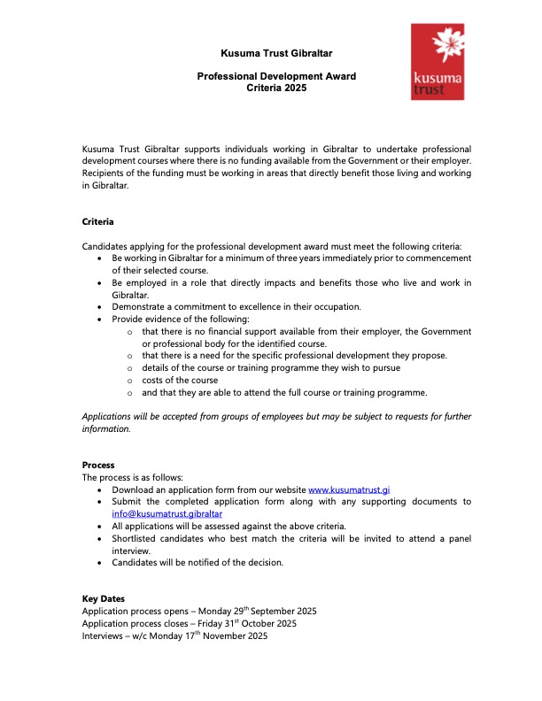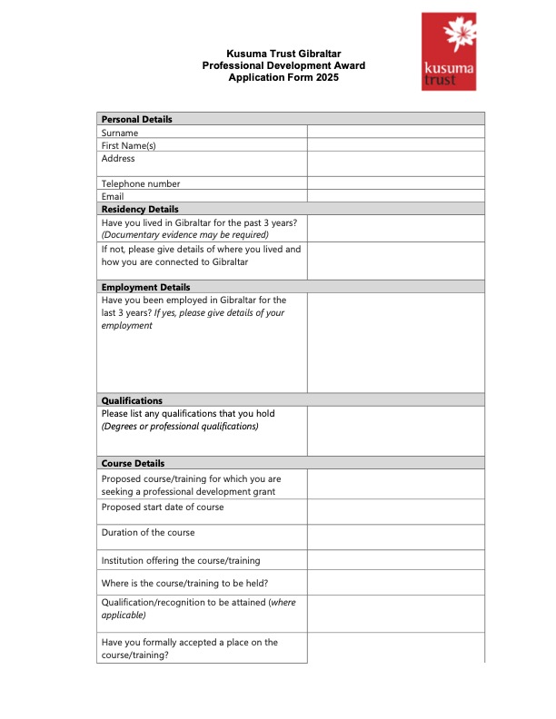 The 2025 application form, criteria, key dates and full details of how to apply can be found and downloaded by clicking on the images below or by clicking on these links: Application form and Further details including dates criteria. You can also read more details about our Professional Development Awards programme here. If you require additional help or assistance with completing the application form, please do not hesitate to contact us via email at info@kusumatrust.gi.